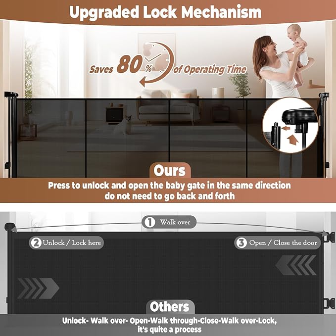 - 【Upgraded Dual Locking Mechanism, Saves 80% of Operating Time】Retractable baby gate not only has a mesh lock to control the retractable function, and on the other side adopts "Push+Press" gate lock to operate open/close the door independently, unlock and open the baby gate in the same direction, do not need to go back and forth, save 80% of the operating time.