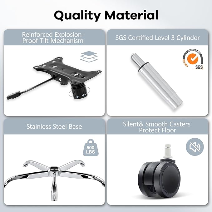 - Sturdy and Durable:Constructed with a high-quality stainless steel base, SGS Level-3 gas lift cylinder, and reinforced explosion-proof tilt mechanism, this chair can support up to 330 lbs. smooth-gliding caster wheels for effortless movement on any floor type.