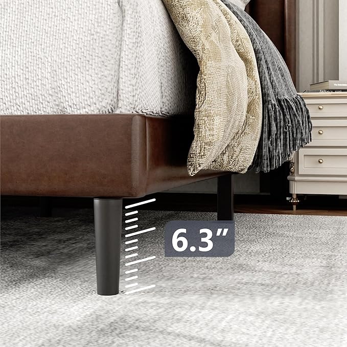 Queen Size Bed Frame with Upholstered Wingback Headboard, Easy Assemnly Platform Bed, Wooden Slat Support No Box Spring Needed, Dark Brown Leather