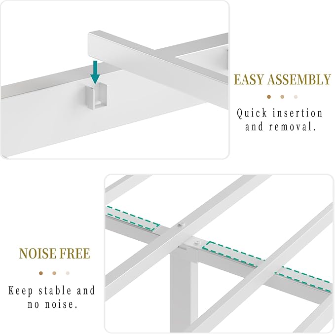- Noiseless Design: Our queen size bed frame design allows you to experience a whisper like quiet comfort. The center bracket is equipped with a unique foam pad, which adopts multi-level noise reduction technology and will not produce any vibration and squeak. This frame is perfect for daycare or bedrooms, providing a peaceful environment without compromising durability, and offering a noise free solution for all sleep modes and sensitive spaces