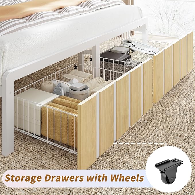 - Multi-function Storage with Rolling Drawers: This queen bed frame with 2 spacious storage sliding drawers at the end of the bed with smooth rollers for easy access. Each drawer is equipped with Velcro that stops sliding to ensure firmness and stability. The 10.4 inches of under-bed clearance provides additional storage space for seasonal items, bedding, or everyday essentials