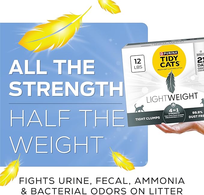 - LIGHTER CAT LITTER: Tidy Cats cat litter lightweight formula is 50 percent lighter than the leading clumping litter--less weight, not less litter.