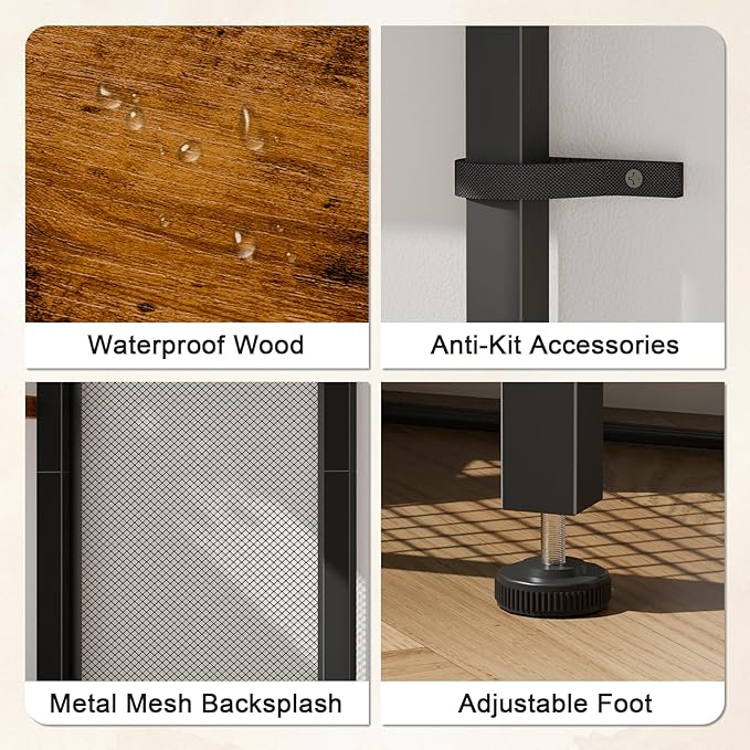- [More Secure Bookcase]:Equipped with a metal mesh backsplash that prevents items from slipping and is suitable for glass bottles and other fragile items. 6 adjustable foot can prevent shaking in uneven places and protect the floor from scratches.