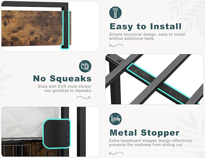 - 【NO Noise & No Sliding Mattress King Bed Frame with Headboard】Provides a comfortable night's sleep, added mute sponge strips to the steel frame to avoid friction between metal parts, which can effectively reduce noise and rattling.Built-in design, fixed stopper, bed with metal baffle to prevent mattress sliding. The best support for latex, spring or memory foam mattress.