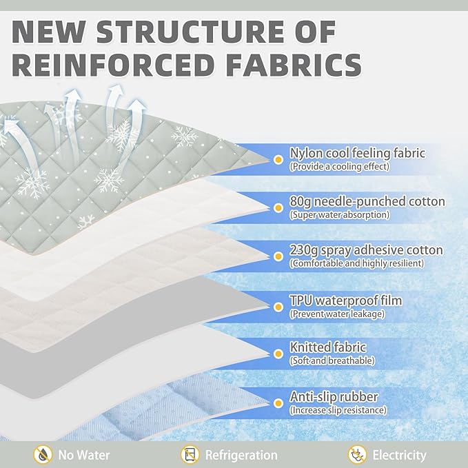 - THICKENED AND UPGRADED FOR GREATER COMFORT: Our new dog cooling pad has been upgraded with a six-layer fabric thickening design. The surface is made of nylon cool fabric, which is skin-friendly; The second layer uses 80g needle-punched cotton, the third layer uses 230g spray-bonded cotton, making the pad softer; The fourth layer is made of TPU waterproof film, making use more reassuring; The fifth and sixth layers use knitted fabric and anti-slip adhesive to prevent the mat from moving freely.