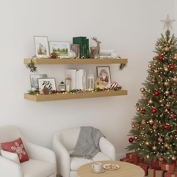 - Sturdy Support - Each wall shelf measures 36"W x 12"D x 2"H. Enhanced Military Grade Hardware brackets hold up to 65 lbs, 2.5ยฐ upward angle design ensures long-term stability, preventing tilting or sagging