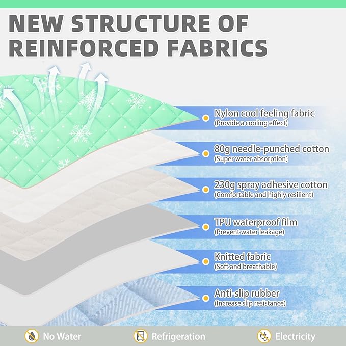 - THICKENED AND UPGRADED FOR GREATER COMFORT: Our new dog cooling pad has been upgraded with a six-layer fabric thickening design. The surface is made of nylon cool fabric, which is skin-friendly; The second layer uses 80g needle-punched cotton, the third layer uses 230g spray-bonded cotton, making the pad softer; The fourth layer is made of TPU waterproof film, making use more reassuring; The fifth and sixth layers use knitted fabric and anti-slip adhesive to prevent the mat from moving freely.