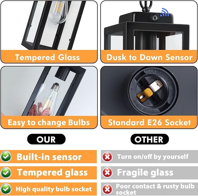 - How to check if your lights are working properly. After the installation is completed, if you find that the porch light is not on, please use the cover to block the sensor up to about 30 seconds, the light will be on; if you need the pendant light to go out, please use the flashlight to shine on the sensor about 15 seconds, the light will go out.