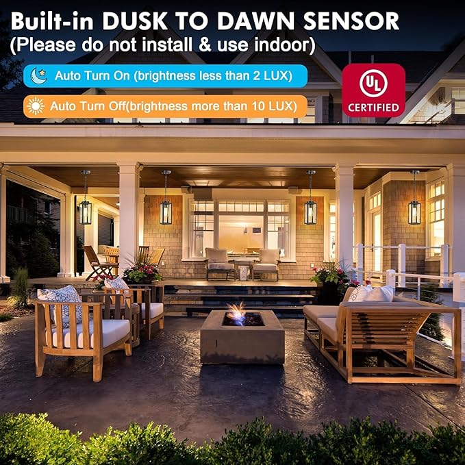 - Free your hands, you'll never have to worry about turning this outdoor pendant light on and off. Why? With the dusk-to-dawn sensor, this outdoor chandelier for porch will automatically turn on at night when the environment is dark (below 2 LUX) and turn off during the day (above 10 LUX). Also, it saves on electricity costs. Outdoor ceiling lights for porch can only be used outdoors. (since the sensor can't work for indoor use)