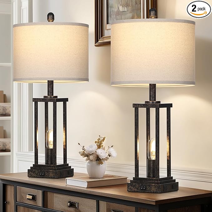 - Farmhouse Table Lamps Set of 2: This bronze living room table lamp is made of high quality alloy with a baked finish. The unique square sturdy frame complements the natural linen lampshade. Not only illuminate your home, but are a artwork that adding industrial and rustic atmosphere to the room and upgrading the overall style. This industrial table lamp's retro tones and elegant frame make it a versatile decoration suitable for a bedroom, office, foyer or living room