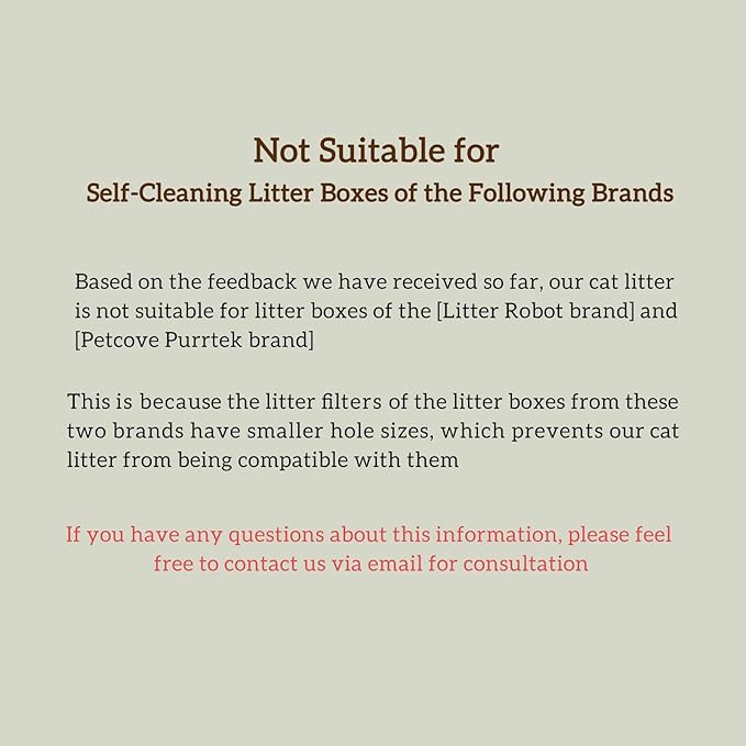 - Tips: Based on the feedback we have received so far, our cat litter is not suitable for litter boxes of the [Litter Robot brand] and [Petcove Purrtek brand] This is because the litter filters of the litter boxes from these two brands have smaller hole sizes, which prevents our cat litter from being compatible with them If you have any questions about this information, please feel free to contact us via email for consultation