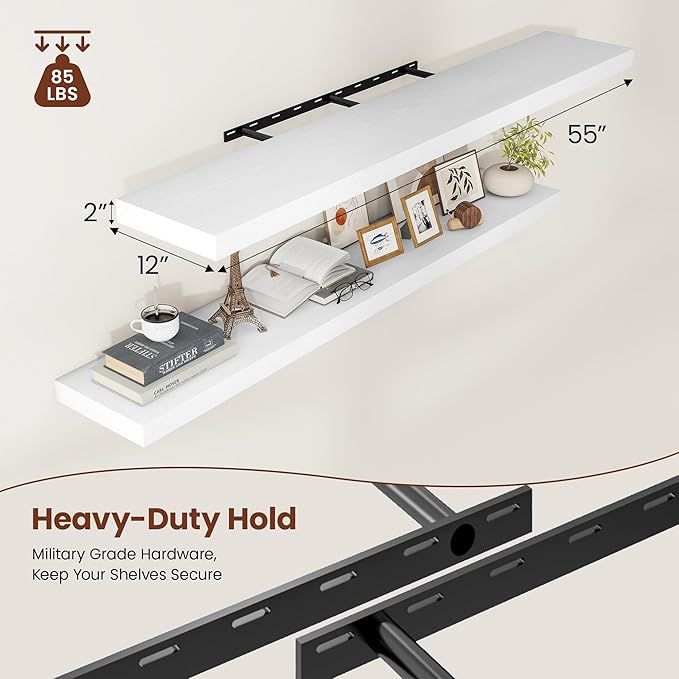 - Sturdy Support - Each wall shelf measures 55"W x 12"D x 2"H. Enhanced Military Grade Hardware brackets hold up to 85 lbs, 2.5ยฐ upward angle design ensures long-term stability, preventing tilting or sagging