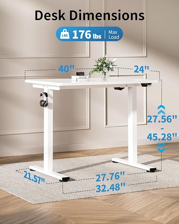 - 【One-Piece Desktop】The adjustable standing desk features a 40" x 24" one-piece desktop, ensuring you have ample space for your monitor, laptop, and more, creating a clutter-free, efficient workspace. That 40 inch desk is available in white, black, and oak colors. The back of the tabletop is specially designed with grooves for easy cable arrangement