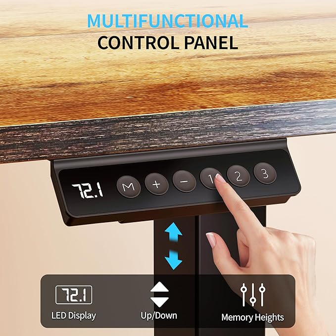 - Ergonomic 55"x24" Desktop: This sit stand desk can accommodate at least two monitors and a laptop. The spacious desktop enhances work efficiency. The 55 inch desk is available in black, and rustic colors. It features a unique wooden pattern, and two headphone hooks, and is FCC and EMC-certified