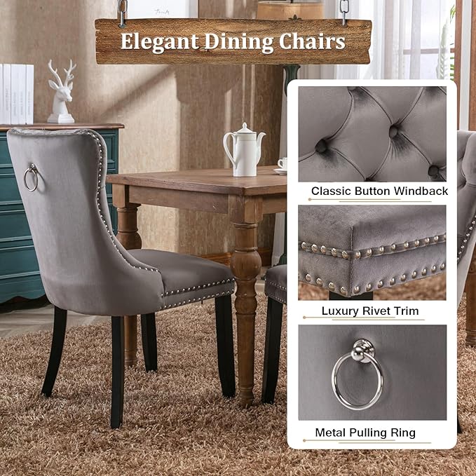 - ➤【Comfy Velvet Upholstered Dining Chairs】- Tufted high backrest have a strong comfortable back support. Plenty decorative rivet inset around cushion and back make this chair looks noble and elegant. High density cushion with high rebound steel spring inner provide a comfortable seating experience. The chair's frame and legs are made of stainless steel with enough security to hold up to 250 pounds. Chair Dimension is 24.6"L x 19.7"W x 37.5"H.