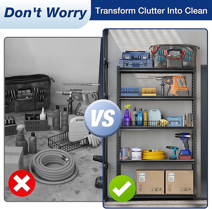 - 2180 LBS Heavy-Duty Capacity : Each shelf supports 436 lbs, with a total capacity of 2180 lbs. These garage shelves provide strong, stable storage for tools, bins, and gear—ideal for heavy duty garage shelving.