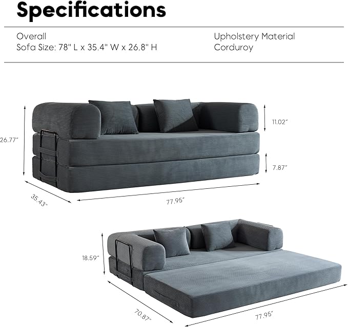 - Spacious Dimensions: The convertible sofa bed offers generous space, measuring 77.9 inches long, 35.4 inches wide, and 26.7 inches high as a sofa, and 77.9 inches long, 70.8 inches wide, and 18.5 inches high as a bed, providing ample room for relaxation and restful sleep.