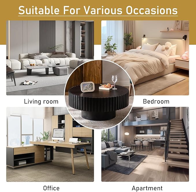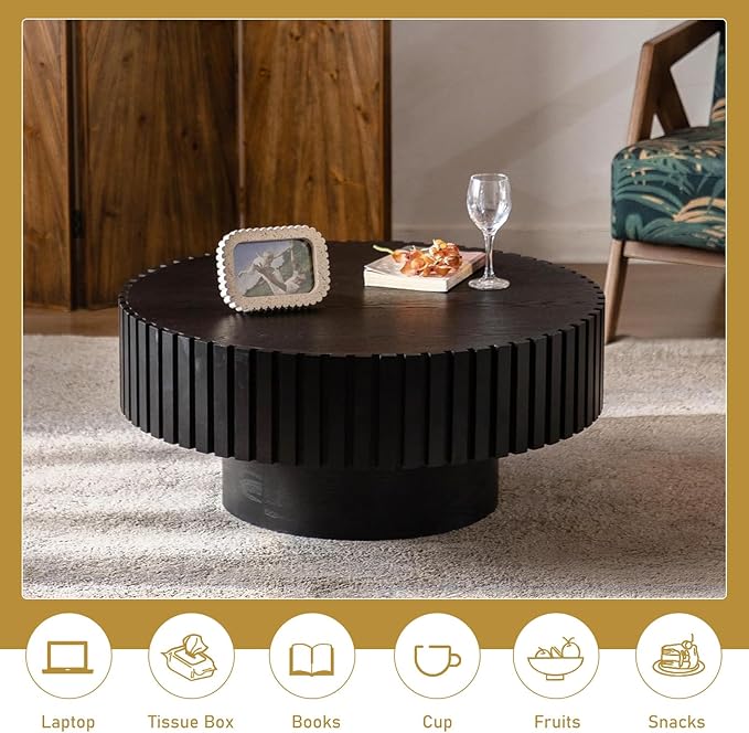 Round Drum Coffee Table 31.5" Wooden Coffee Tables Handcrafted Fluted Drum Coffee Table Modern Luxury Circle Center Table Vintage Farmhouse Center Table for Living Room (Round Black)