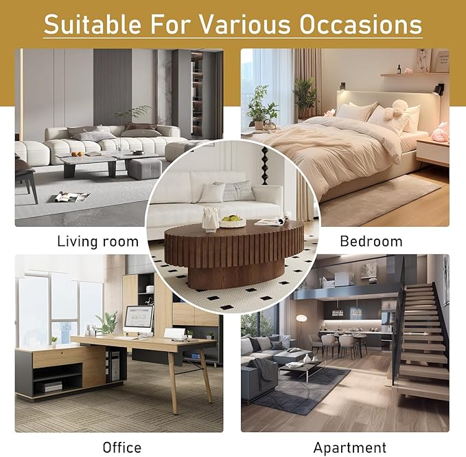 - [Modern Wooden Coffee Table] With oval shape and the design of the side gears and grooves makes it both elegant and industrial.Our beautifully crafted wooden coffee tables boast a sleek and modern design, making them a fit for any room decor. And the surrounding grooves and reliefs are all handmade designs. This beautiful coffee table is suitable for placement in any room.
