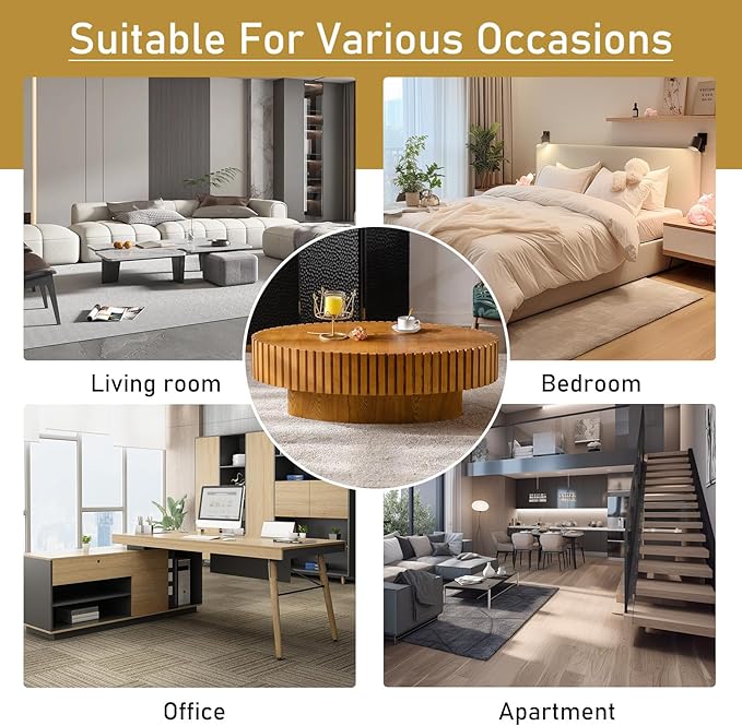 - [Compact Farmhouse Coffee Table] The surrounding reliefs are made of solid wood, combining a robust structure with aesthetic appeal. This minimalist and space-saving drum coffee table is perfect for apartments, bedrooms, and narrow areas. It efficiently utilizes your living space, making it an ideal choice for any home seeking to maximize roominess.