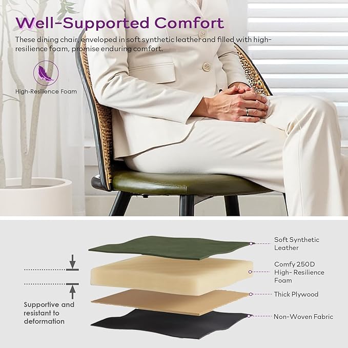 - Premium Multi-Layer Seat Engineering: From the stain-resistant faux leather surface that cleans with a single wipe, down to the stabilizing non-woven base layer, every detail ensures lasting comfort. High-resilience 250D foam cushions your body while the reinforced wood core evenly distributes weight up to 300lbs. Specially designed as chairs for dining table longevity, the quadruple-secured construction prevents fabric slippage and edge wear, making these farmhouse dining chairs ideal for daily family meals or formal gatherings.