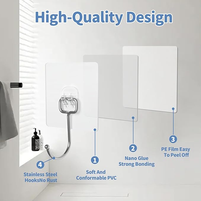 - "【Waterproof & Rustproof Shower Hooks】 Self adhesive hooks with stainless steel hooks and waterproof seals securely hold towels, loofahs, or bath caddies as hooks for shower wall. Heavy duty hooks resist rust in high humidity, while adhesive hooks for hanging remove cleanly—no residue."