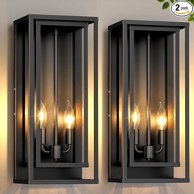 - Modern Design & Stylish Appearance: Designed with a classic matte black finished frame with rectangle shape, adding an elegant and minimalist style to these black outdoor wall lights. Equipped with clear glass shades increase a sense of modern and stylish appearance to the 2-pack wall mount lights. Three pieces of high-quality tempered glass not only protect the bulb but transmit light to create a gentle and cozy atmosphere