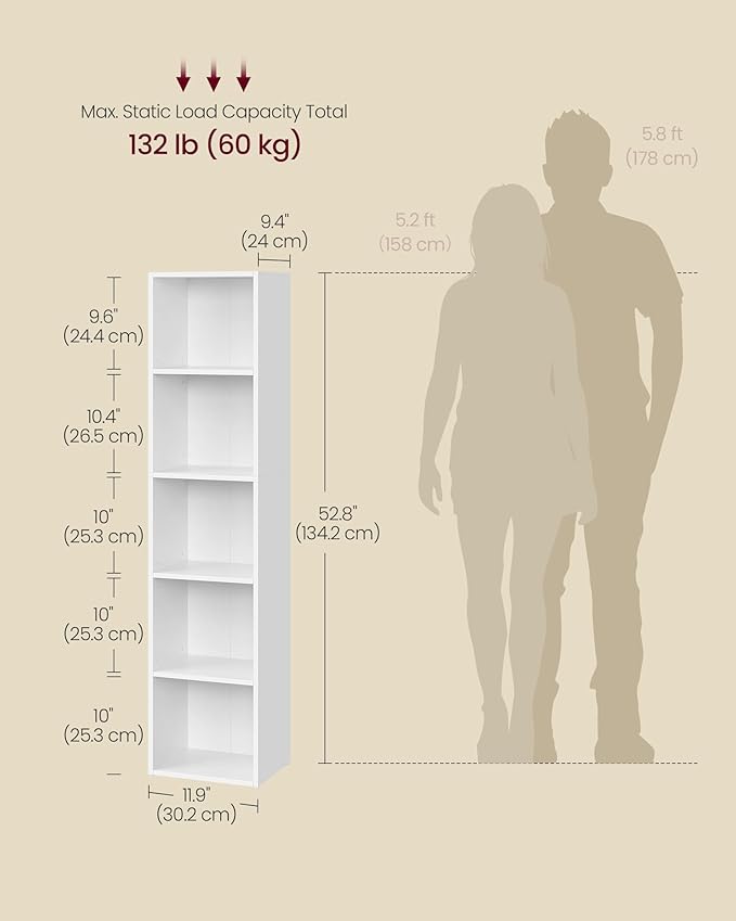 - 【SPACE-SAVING & ADJUSTABLE】This 5-tier bookcase, measuring 9.4"D x 11.9"W x 52.8"H, optimizes vertical space. The 2nd, 4th and 5th tiers are adjustable to 3 heights (up or down 1.2"), easily accommodating tall books, artwork, or storage boxes