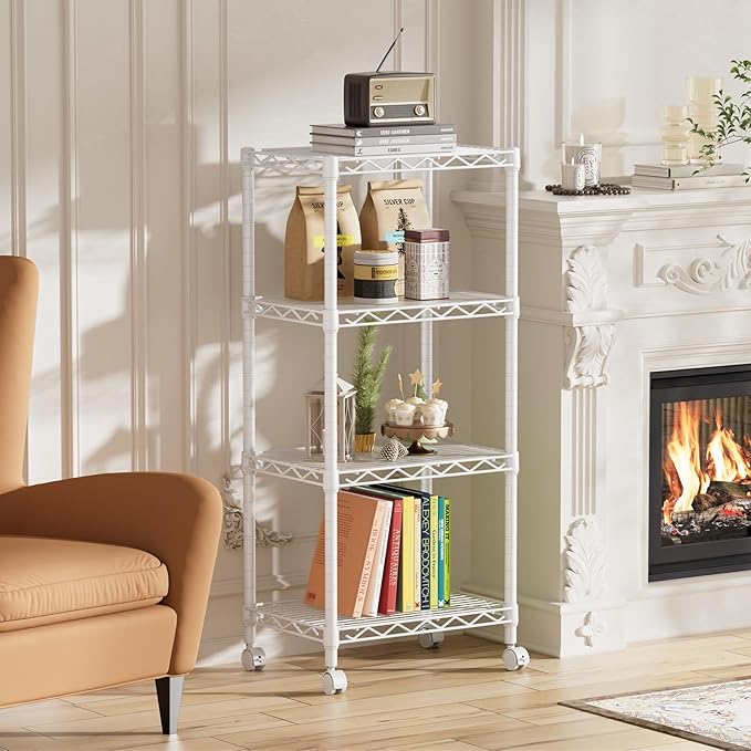 SINGAYE 4 Small Shelves Storage Shelf Wire Shelving Unit Metal Shelf Adjustable Organizers Storage Shelving with Wheels for Bathroom Laundry Room Kitchen Pantry11.5”D x 17.3”W x 44.5”H White