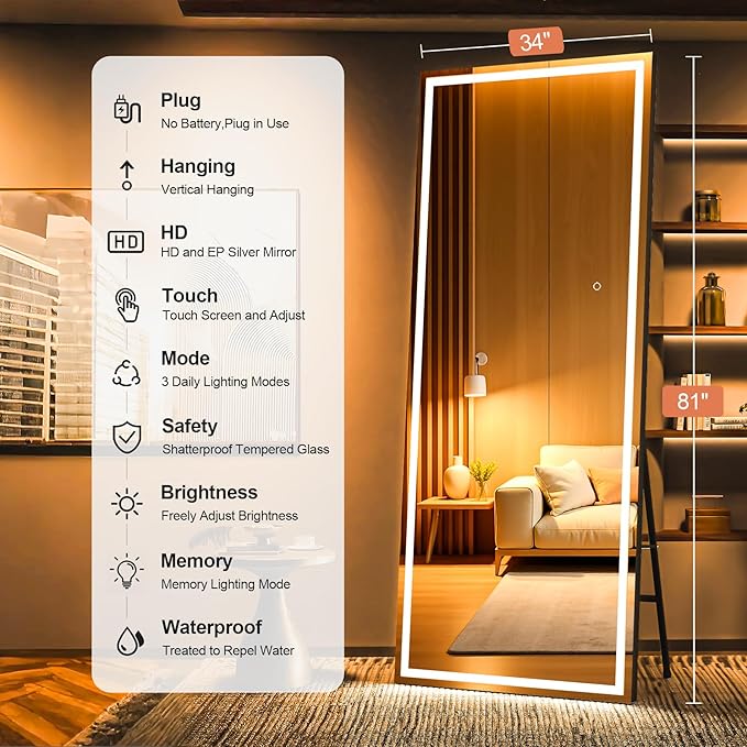 - 【Dimmable & 3 Color Temperature】This lighted full length mirror is multifunctional. You can press the button to change the color temperatures: Warm(3000K), natural (4000K) and white(6000K). You can also dim the brightness to your comfortable level. All these will be easily controlled by the touch button.