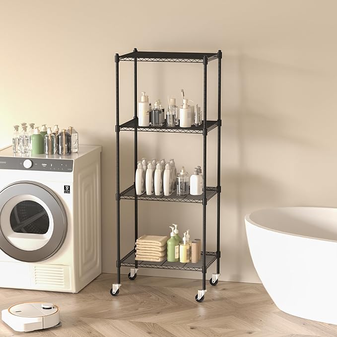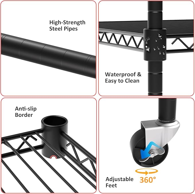 - 【Adjustable Feet and Convenient Wheels】The wire shelving with wheels comes with 4 sturdy 360 degree rollers, two of which can be locked, so you can push the storage shelves with wheels to where you need it, anytime, anywhere, and keep it in place. The adjustable leveling feet can keep the metal shelves in a fixed position, so that the device can maintain balance and stability, and solve the problem of uneven ground.