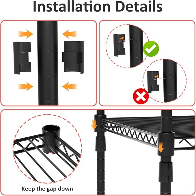 - 【Easy Assembly】The wire shelves with wheels is easy to assemble, does not require any tools, and the height of each layer can be adjusted according to needs, just clamp the metal grid plate on the column, and then slide the metal grid plate along the column until the metal shelf is firmly fixed on the buckle. The shelving with wheels also comes with a user manual to guide you through the quick and easy assembly process.