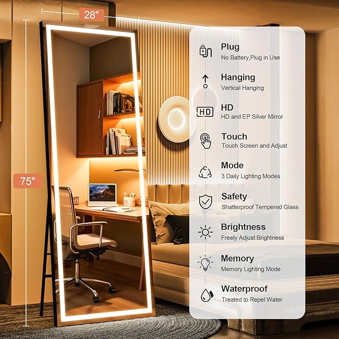 - 【Dimmable & 3 Color Temperature】This lighted full length mirror is multifunctional. You can press the button to change the color temperatures: Warm(3000K), natural (4000K) and white(6000K). You can also dim the brightness to your comfortable level. All these will be easily controlled by the touch button.