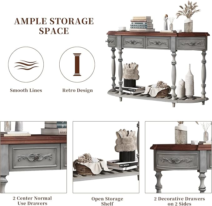 - Exquisite Design: Elegant half-moon shape,rounded design on both ends,4 Roman legs and exquisite carvings on the drawers make this curved console table full of Roman features. Place this exquisite and beautiful console table in your home,it will become a bright landscape,adding a vintage and elegant atmosphere to your home.