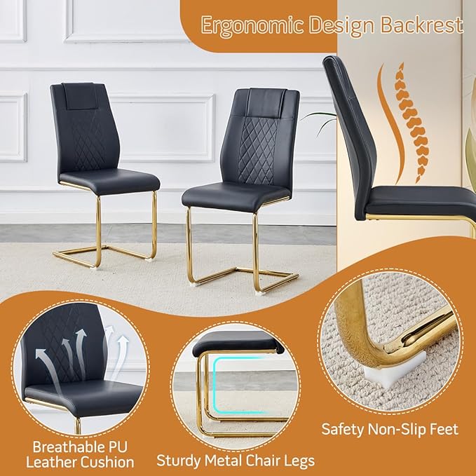 - Glass Dining Room Table Set:Upgrade your dining space, featuring a tempered glass tabletop that is easy to clean. The luxury gold base and Black PU leather chairs add a contemporary touch, making it perfect for both home and apartment use