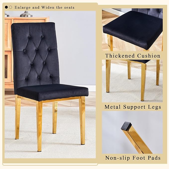- Glass Dining Room Table Set:Upgrade your dining space, featuring a tempered glass tabletop that is easy to clean. The luxury Goldr base and Black velvet chairs add a contemporary touch, making it perfect for both home and apartment use