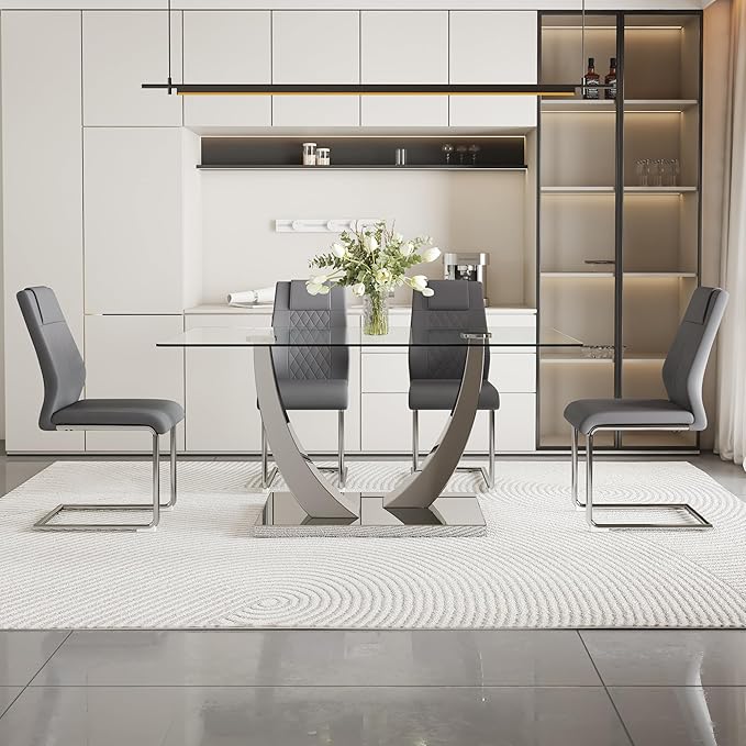 - Glass Dining Room Table Set:Upgrade your dining space, featuring a tempered glass tabletop that is easy to clean. The luxury silver base and Dark Grey PU leather chairs add a contemporary touch, making it perfect for both home and apartment use