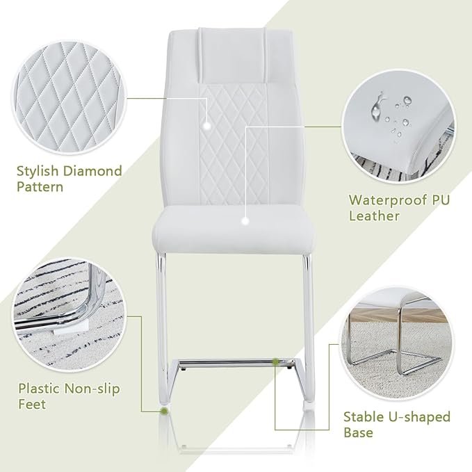 - Glass Dining Room Table Set:Upgrade your dining space, featuring a tempered glass tabletop that is easy to clean. The luxury silver base and white PU leather chairs add a contemporary touch, making it perfect for both home and apartment use