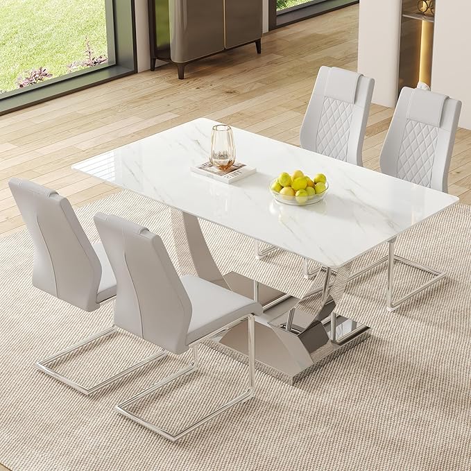 63" Modern Dining Table Set for 4, White Dining Room Set for 4, Tempered Glass Kitchen Table and PU Leather Chairs, Marble Pattern Top with Sturdy Silver Chrome Base