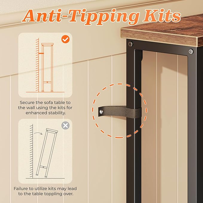 - 【Strong, Stable & Safe】Made from high-quality engineered wood and a sturdy metal frame, this behind the sofa table is built for daily use. Anti-tip kit included for wall-mount safety, plus upgraded larger adjustable feet keep it steady on uneven floors, much more stable than smaller leg bases