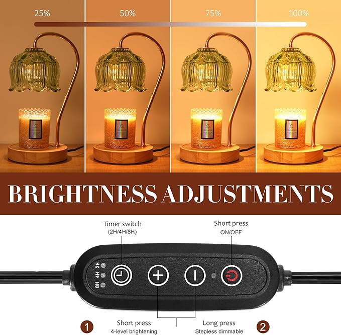 - 【Adjustable Brightness & Temperature】Featuring four dimmable settings, allowing for precise adjustment of the wax melting speed.Adjusting to a higher brightness setting accelerates the release of fragrances. Package includes two 50W bulbs.(Candles not included.)