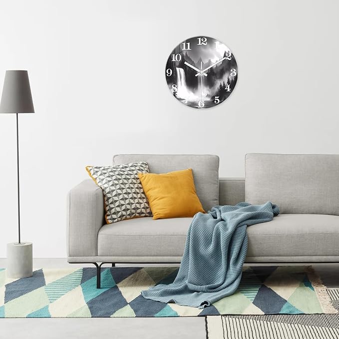 XNM 14 Inch Waterfall Wall Clock for Living Room Analog Natural Landscape Black and White Glass Wall Clocks Battery Operated Round Wall Clock Silent