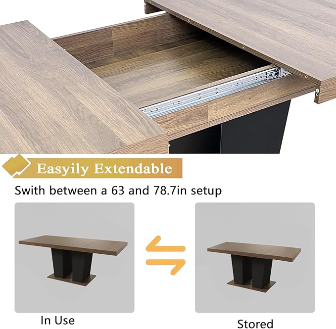 - Wood Extendable Dining Table - This expandable table adopts a modern farmhouse style, dark brown wood grain and black legs make this dining table elegant and natural. This wooden kitchen table is made of Engineered Wood tabletop and pedestal base, which is durable and stable. Whether it's a spill or a scratch, you can rest easy knowing that your table can withstand everyday usage.