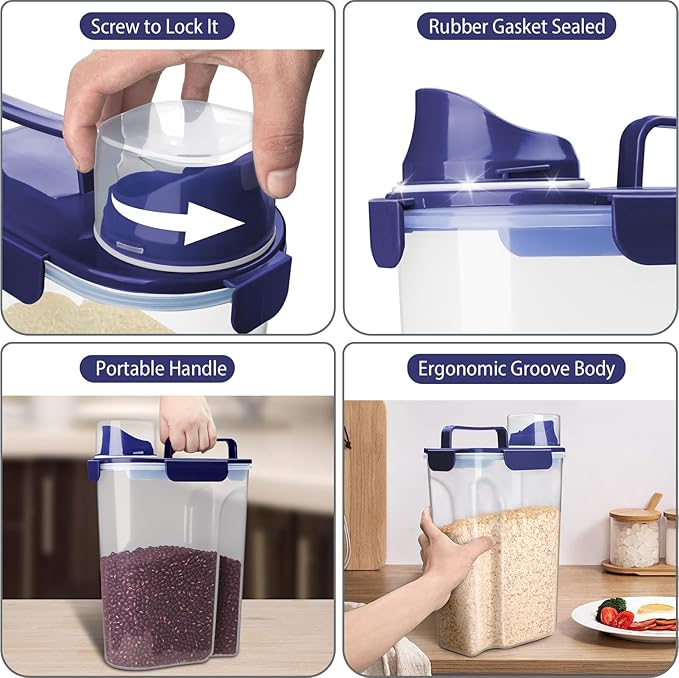 - 🥫【Airtight Seal Rice Storage】The airtight rice storage diepenser with featuring airtight 4 side-locking lid and measuring cup screw on over the pour spout, can protect food from moisture, ants and all bugs, and keep them dry and fresh. Say goodbye to stale and soggy food!