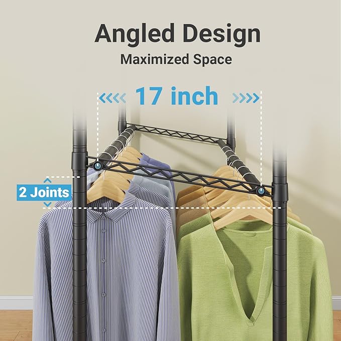 - 2-Sided Adjustable Hanging & Shelves: Features double hanging rods (front and back) at staggered heights to prevent clothes overlapping. Three height-adjustable wire shelves accommodate folded clothes, shoes, or storage bins. Maximize your space with this versatile closet rack.