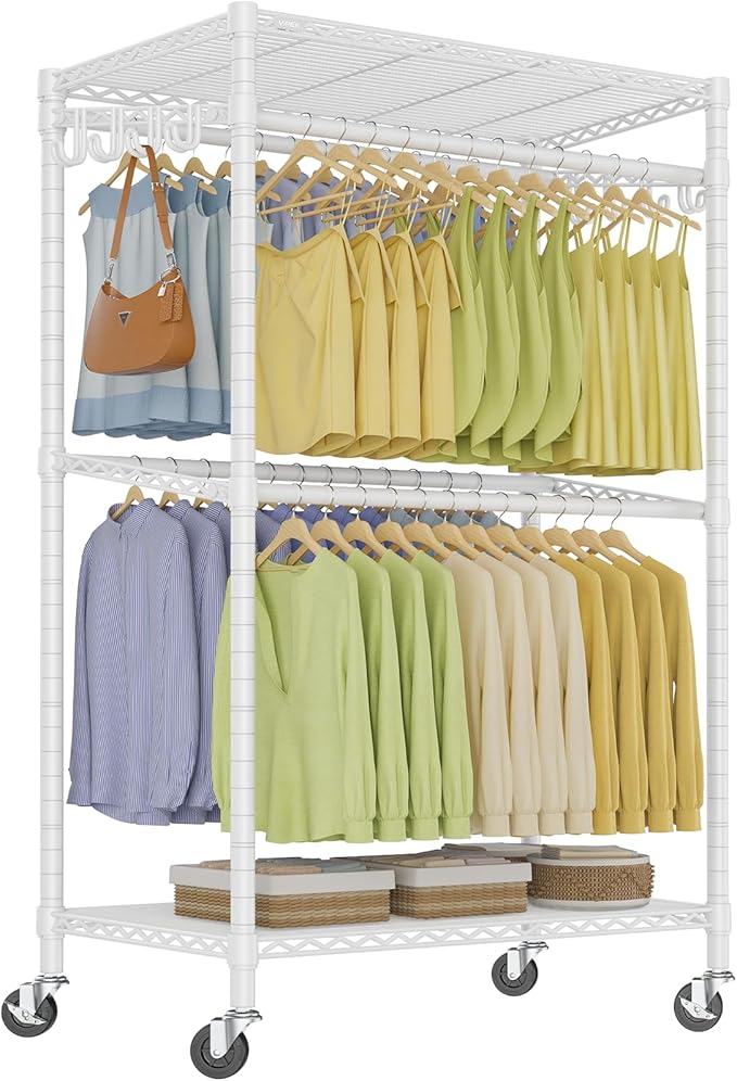 - Heavy-Duty Metal Construction: Built with a reinforced carbon steel frame, this rolling clothes rack supports up to 600 lbs. Easily holds heavy winter coats, bulky items, or storage bins.