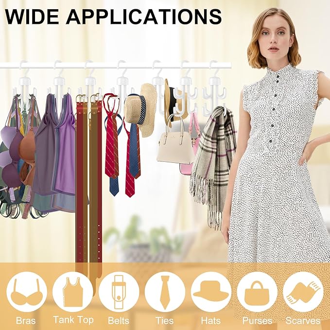 - Everything Is Visible: Each tank top hanger has 4 pairs of rotatable 180° hooks at the bottom and a 360° swivel hook on the top. Bra hangers allows you to easily access and store all your clothes, enabling you to effortlessly pick up or put away any bra or vest from any angle. Scarf hanger organizer makes clothes clearly visible and simplifies your daily storage tasks