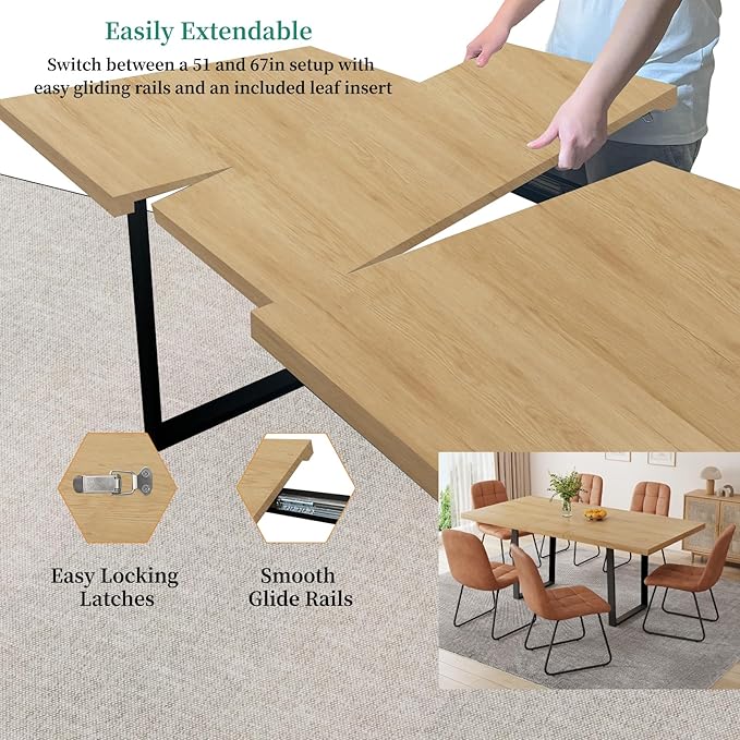 - 【Expandable Table for Flexible Seating】:The 51" table extends to 67" to comfortably seat 6 people, offering flexible seating for both everyday meals and larger gatherings. Table dimensions: 51" (L) x 35.4" (W) x 29.9" (H) when unextended, and 67" (L) x 35.4" (W) x 29.9" (H) when fully extended.
