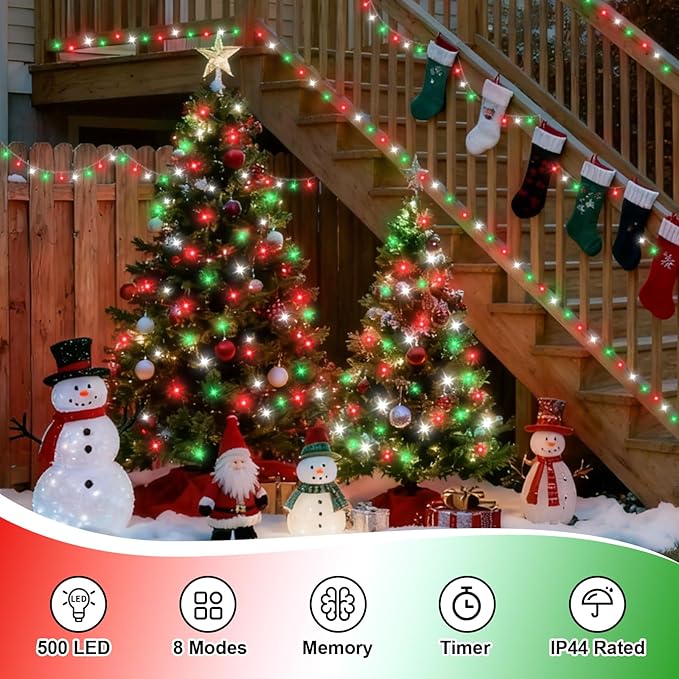 QITONG Red White Green Christmas Light Outdoor Waterproof, 165ft 500 LED String Lights with 8 Modes, Clear Wire Christmas Tree Light Indoor Plug-in