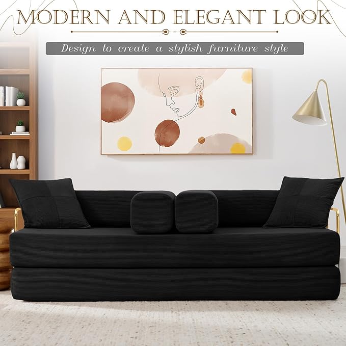 Antetek Convertible Futon Sofa Bed, 3-Seater Modern Corduroy Foam Floor King Size Bed Fold Out Sleeper Lounge Loveseat Sofa Couch with 2 Throw Pillows for Living Room Bedroom Guest Room, Black